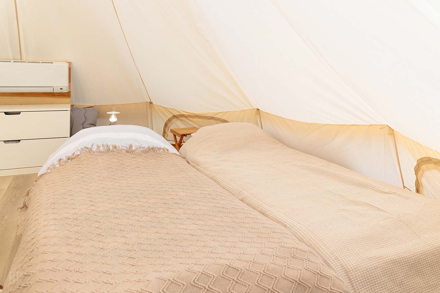 設備 | シングルベッド2台+エクストラベッド2台 広々20㎡のグランピングベルテント + 専用ウォーターテント(洗面・トイレ) 専用テラス付きで開放的な滞在 ※家具などについては変更となる場合があります。 ※上記設置数以上のベッドの場合はオプションにて承ります。 |